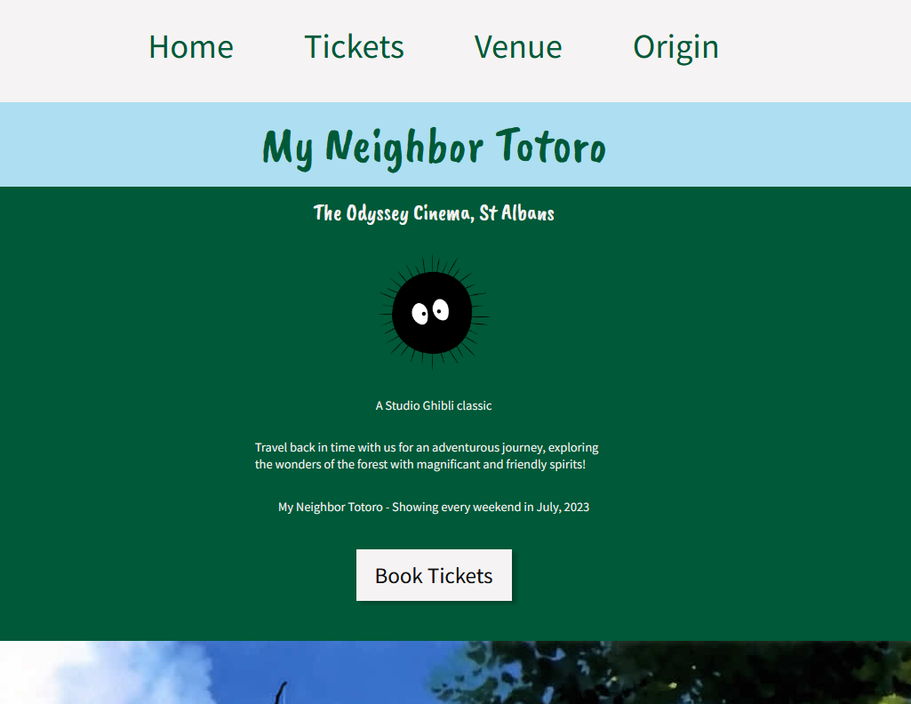 Briefed with creating a promotional website for a film released pre 2000 to entice customers to a local independent cinema, I chose one of my favourite Ghibli films My Neighbor Totoro.
